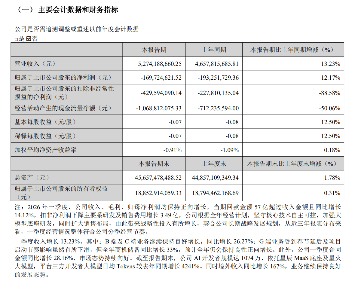 4月28日,科大讯飞(002230.SZ)公告称,2026年第一季度实现营业收入52.74亿元,同比增长13.23%;归属于上市公司股东的净利润亏损1.70亿元,上年同期亏损1.93亿元。业绩变动主要系公司收入、毛利、归母净利润均保持正向增长,扣非净利润下降主要系研发及销售费用增长3.49亿元。