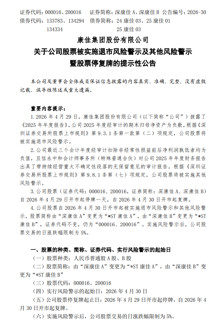 4月28日,深康佳A(000016.SZ)公告,公司2025年度经审计的期末归母净资产为负数,公司股票将被实施退市风险警示。公司最近三个会计年度经审计扣除非经常性损益前后净利润孰低者均为负值,且信永中和会计师事务所(特殊普通合伙)对公司2025年年度财务报告出具了带持续经营重大不确定性段落的无保留意见的审计报告。公司股票将被实施其他风险警示。公司股票自2026年4月29日开市起停牌一天,自2026年4月30日开市起复牌。公司股票自2026年4月30日开市起被实施退市风险警示和其他风险警示,股票简称由“深康佳A”变更为“*ST康佳A”,由“深康佳B”变更为“*ST康佳B”,证券代码不变,仍为“000016、200016”。实施风险警示后,公司股票交易的日涨跌幅限制为5%。