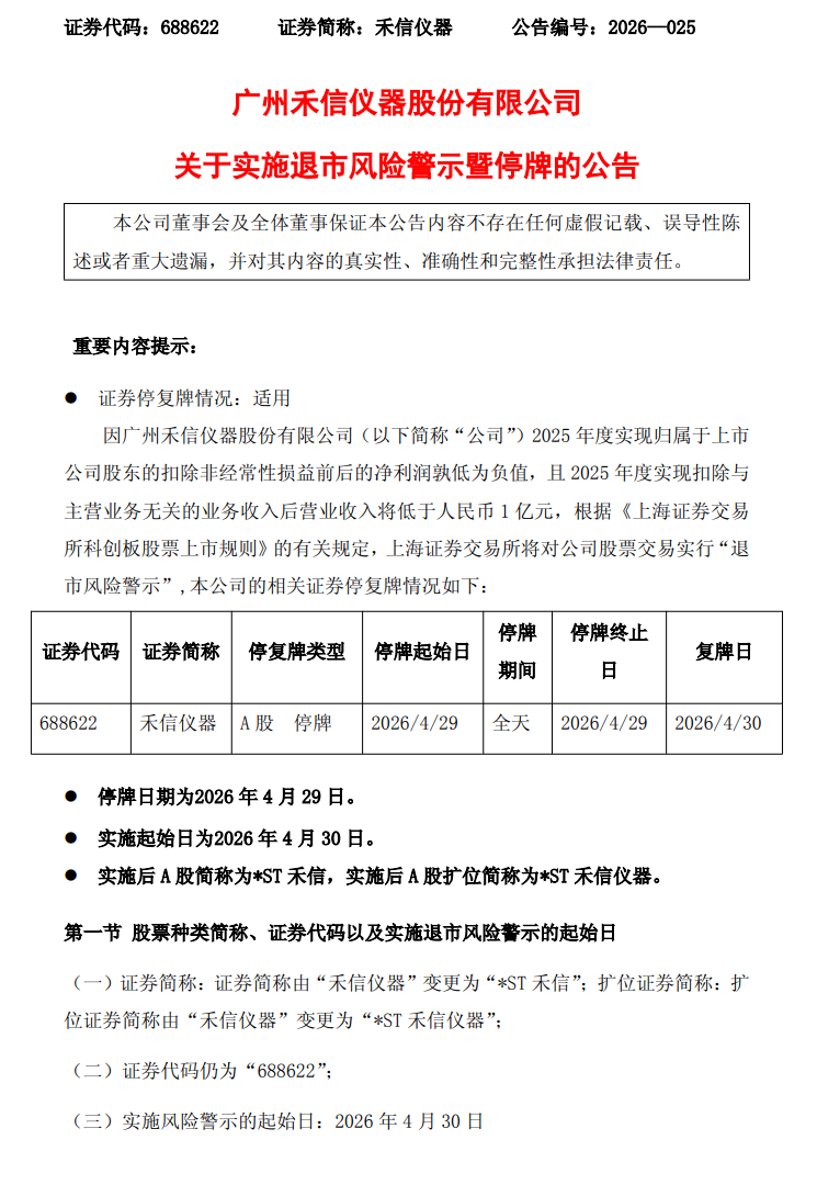 4月28日,禾信仪器(688622.SH)公告称,公司2025年度经审计的扣除非经常性损益前后的净利润孰低为负值,且扣除与主营业务无关的业务收入后营业收入低于1亿元,根据相关规定,上海证券交易所将对公司股票实施退市风险警示。公司股票于2026年4月29日停牌,自2026年4月30日起复牌并实施退市风险警示,A股简称变更为*ST禾信。