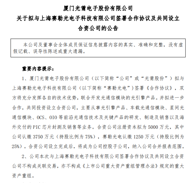 4月28日,光莆股份(300632.SZ)公告称,公司拟与上海赛勒光电子科技有限公司签署合作协议,双方将联合开发光通信模块的光引擎产品。并拟进一步合作,共同投资设立合资公司,主要从事光引擎产品、车载光通信模块、星间光通信模块、OCS、OIO等前沿光通信技术及关键产品的研发、制造及销售等业务。合资公司注册资本拟为5000万元,其中公司认缴3750万元,持股比例为75%。