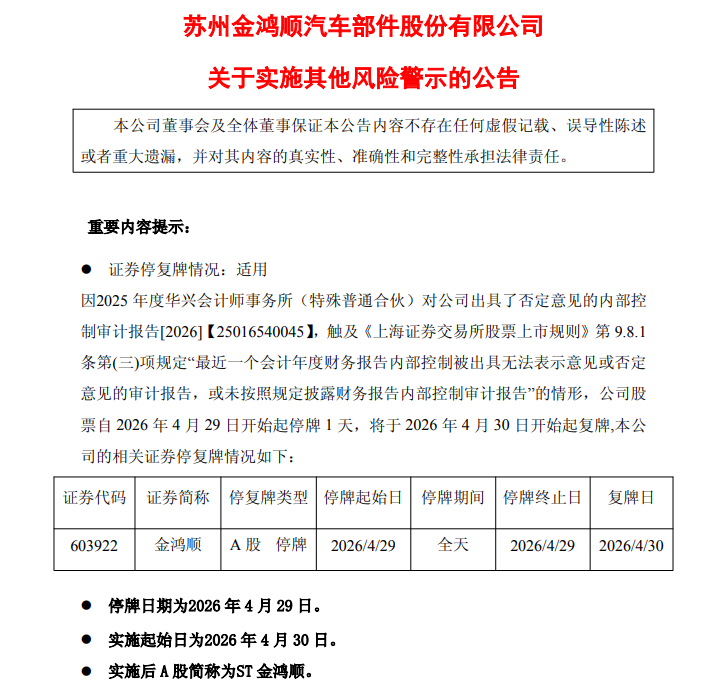 4月28日,金鸿顺(603922.SH)公告称,因2025年度华兴会计师事务所(特殊普通合伙)对公司出具了否定意见的内部控制审计报告,触及相关规定,公司股票自2026年4月29日停牌1天,4月30日起复牌并实施其他风险警示,股票简称变更为“ST金鸿顺”,日涨跌幅限制为5%。