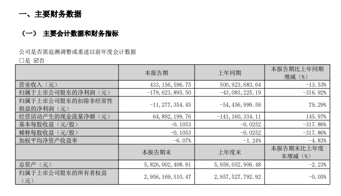 026年第一季度实现营业收入4.33亿元,同比下降13.53%;归属于上市公司股东的净利润亏损1.80亿元。净利润同比下降316.92%。