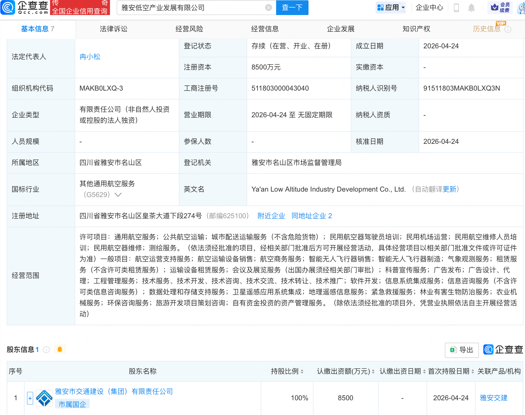 企查查APP显示,近日,雅安低空产业发展有限公司成立,注册资本8500万元,经营范围包含:航空运营支持服务;航空运输设备销售;航空商务服务;智能无人飞行器销售;智能无人飞行器制造;卫星遥感应用系统集成;地理遥感信息服务等。企查查股权穿透显示,该公司由雅安市交通建设(集团)有限责任公司全资持股。