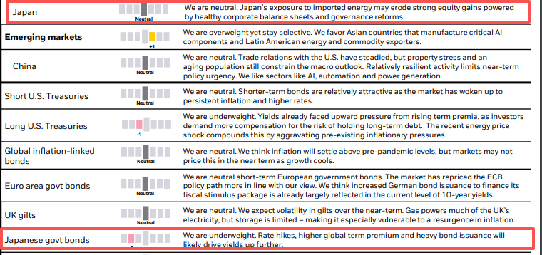 贝莱德称日央行抑制高通胀推国债收益上升,能源依赖制约股市,维持中性判断。