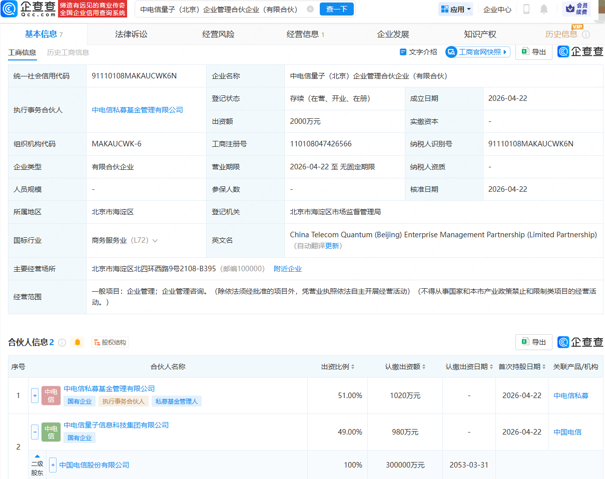 企查查APP显示,近日,中电信量子(北京)企业管理合伙企业(有限合伙)成立,出资额2000万元,经营范围包含:企业管理;企业管理咨询。企查查股权穿透显示,该合伙企业由中电信私募基金管理有限公司、中国电信(601728.SH)全资子公司中电信量子信息科技集团有限公司共同持股。