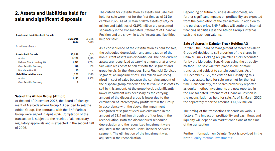 报告明确指出:“梅赛德斯-奔驰集团董事会于2025年12月底决定出售Athlon集团。与法国巴黎银行集团的合同于2026年4月签署。”这笔交易目前正在等待监管机构的批准,并“预计在2026年下半年完成”。这笔交易对集团的财务状况产生了直接影响。在2026年第一季度的财务报告中,Athlon集团的资产(92.39亿欧元)和负债(11.93亿欧元)已被单独列为“持有待售”。同时,由于此次出售预期,梅赛德斯-奔驰金融服务分部在成本中确认了一笔3.8亿欧元的减值损失。不过,报告解释称,在集团层面,由于内部利润的抵销,实际减值影响会显著降低。