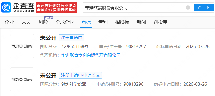 荣耀申请注册“YOYO CLAW”商标 财闻 2026-04-29 15:15:08 国际分类为设计研究、科学仪器,当前商标状态为注册申请中。 企查查APP显示,近日,荣耀终端股份有限公司申请注册“YOYO CLAW”商标,国际分类为设计研究、科学仪器,当前商标状态为注册申请中。添加图片注释,不超过50个字(选填)