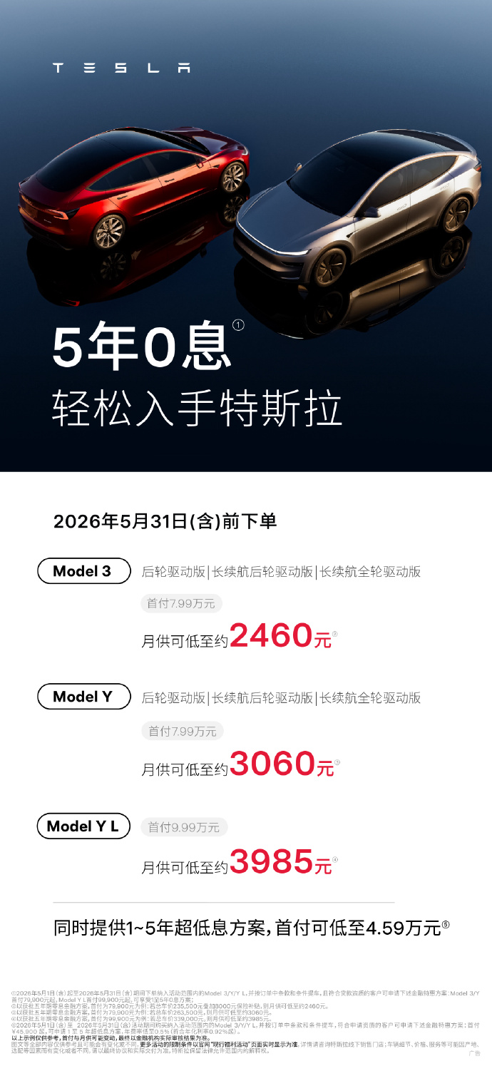 4月29日,特斯拉中国发布5月购车政策,特斯拉(TSLA.US)Model3/Y/YL可享5年0息,首付低至7.99万元,月供低至2460元。另有1-5年低息方案,首付低至4.59万元。