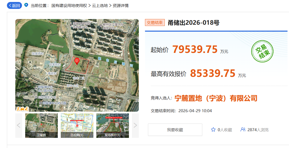 该地块经过30轮竞价,最终宁麓置地(宁波)有限公司(宁波城投)以总价8.53亿元竞得该地块,成交楼面价28212元/㎡,溢价率7.29%。