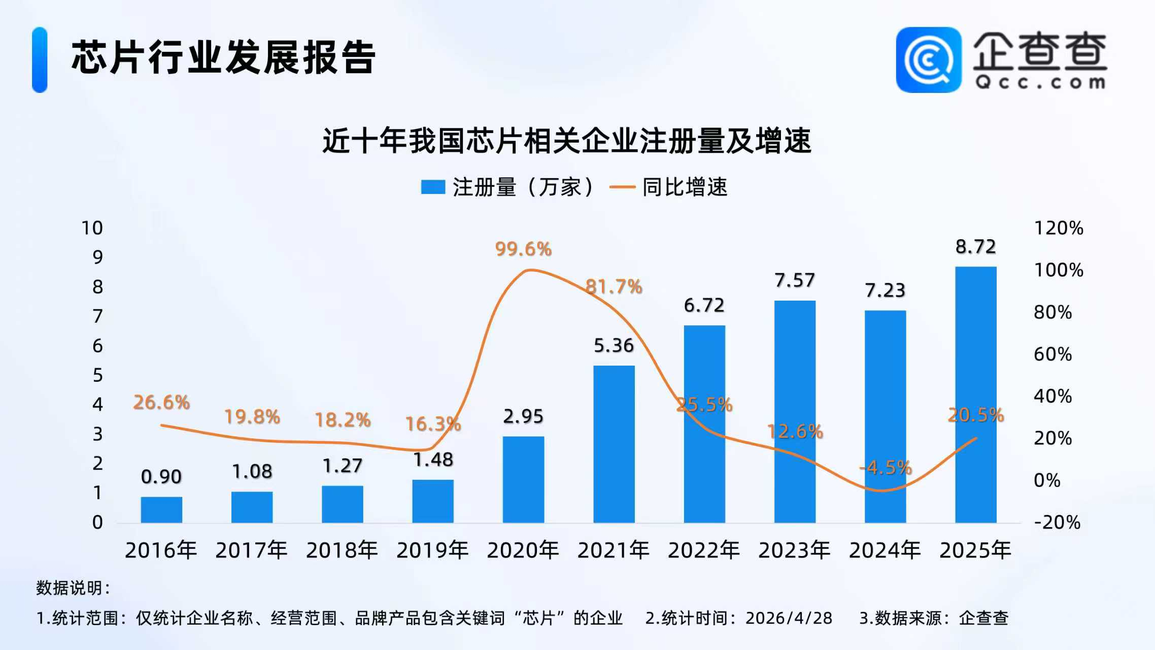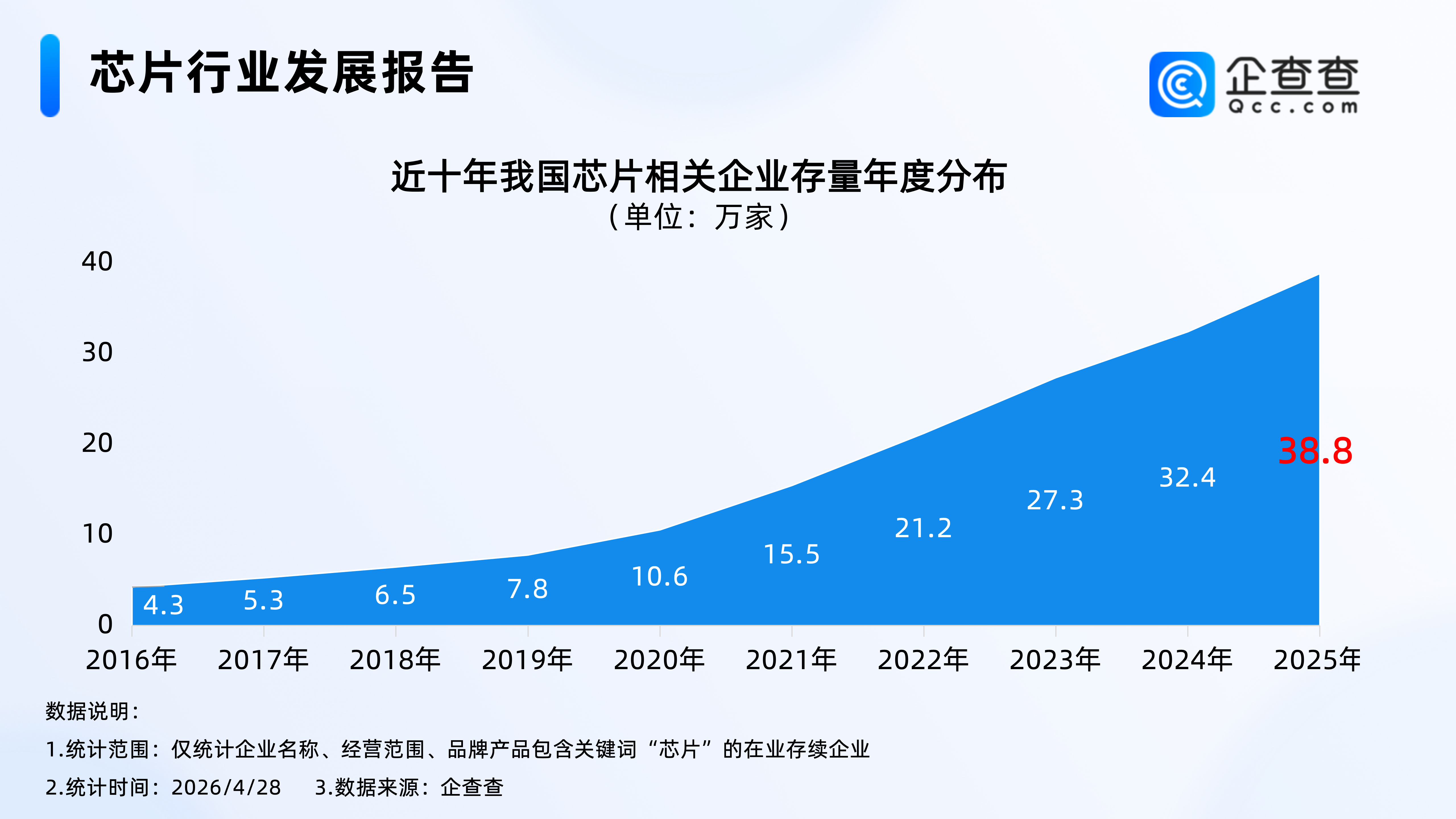 截至4月28日,2026年我国已注册2.6万家芯片相关企业。企业存量方面,截至2026年4月28日,我国现存超40万家芯片相关企业。