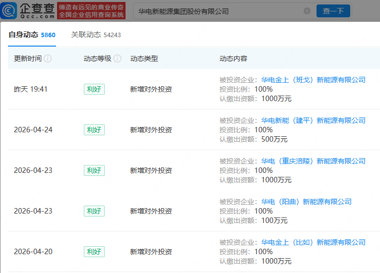 近期,华电新能已连续成立多家新能源子公司。
