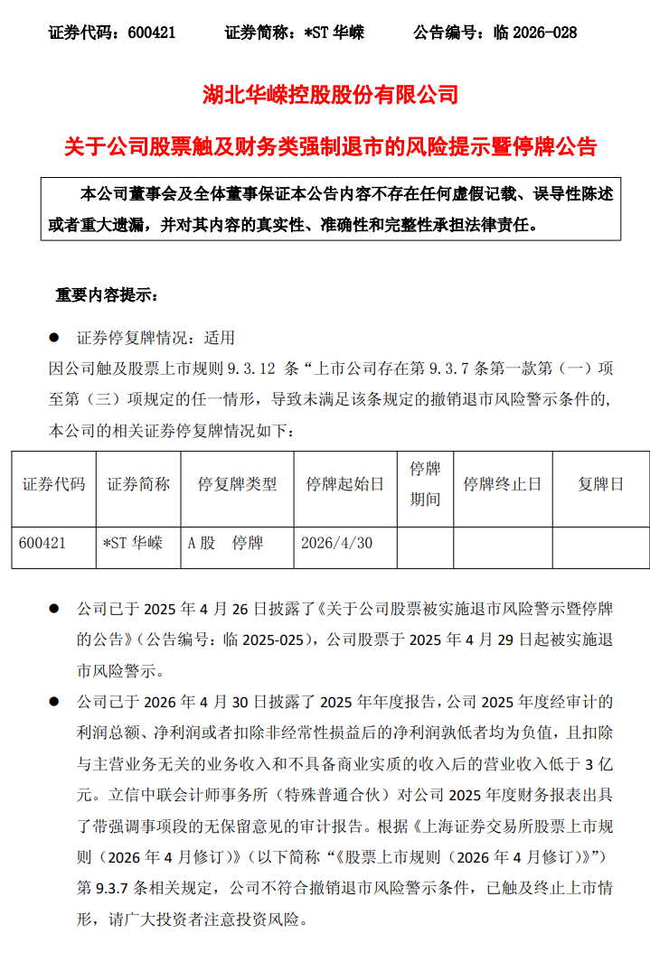 4月29日,*ST华嵘(600421.SH)公告称,公司己于2026年4月30日披露了2025年年度报告,公司2025年度经审计的利润总额、净利润或者扣除非经常性损益后的净利润孰低者均为负值,且扣除与主营业务无关的业务收入和不具备商业实质的收入后的营业收入低于3亿元。立信中联会计师事务所(特殊普通合伙)对公司2025年度财务报表出具了带强调事项段的无保留意见的审计报告。根据《上海证券交易所股票上市规则(2026年4月修订)》(以下简称“《股票上市规则(2026年4月修订)》”)第9.3.7条相关规定,公司不符合撤销退市风险警示条件,已触及终止上市情形,请广大投资者注意投资风险。公司股票自2026年4月30日起停牌,上海证券交易所将在停牌后5个交易日内发出拟终止上市的事先告知书。