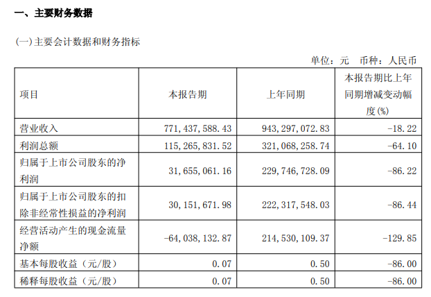 2026年第一季度营收为7.71亿元,同比下降18.22%;净利润为3165.51万元,同比下降86.22%。