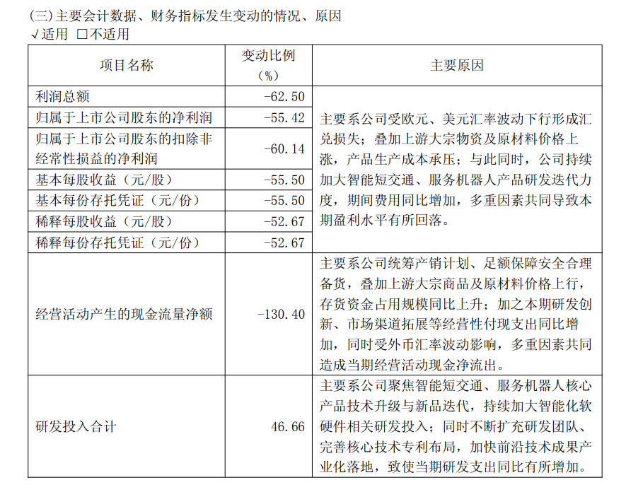 业绩变动主要系:公司受欧元、美元汇率波动下行形成汇兑损失;叠加上游大宗物资及原材料价格上涨,产品生产成本承压;与此同时,公司持续加大智能短交通、服务机器人产品研发迭代力度,期间费用同比增加,多重因素共同导致本期盈利水平有所回落。