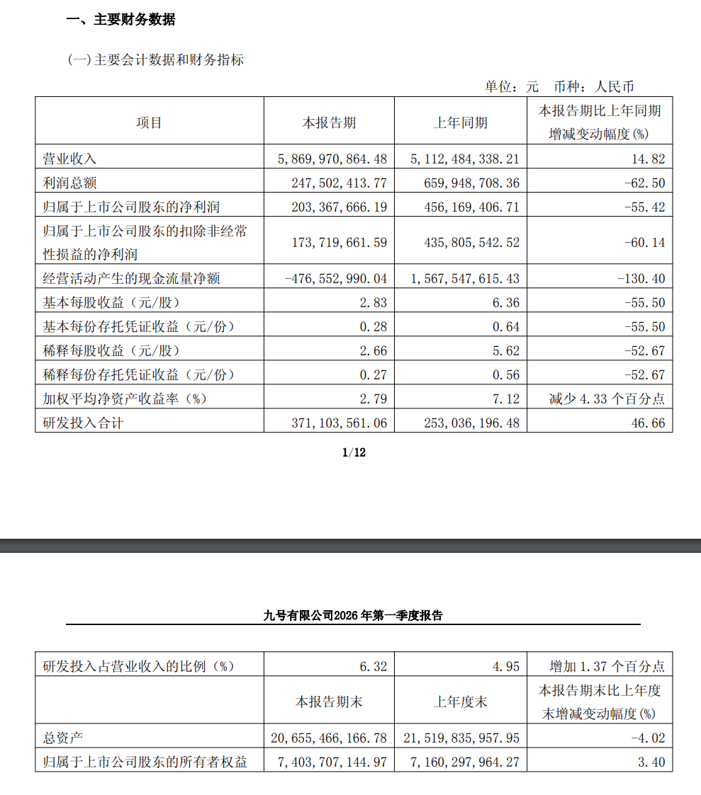4月29日,九号公司-WD(689009.SH)公告称,2026年第一季度实现营业收入58.70亿元,同比增长14.82%;归属于上市公司股东的净利润为2.03亿元,同比下降55.42%。