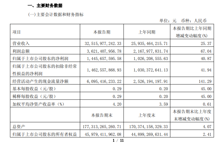 2026年第一季度营业收入325.16亿元,同比增长25.37%;净利润14.46亿元,同比增长40.87%。
