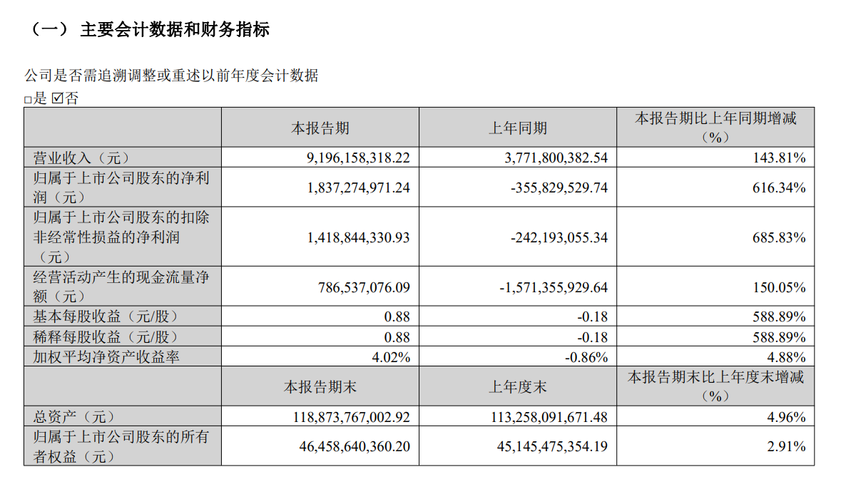 归属于上市公司股东的净利润为18.37亿元,上年同期亏损3.56亿元,同比扭亏为盈。业绩变动主要系本期锂系列产品和锂电池系列产品价量齐升所致。