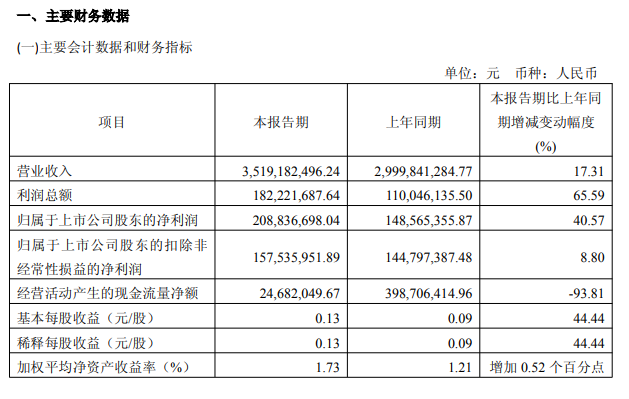 2026年第一季度营业收入35.19亿元,同比增长17.31%。利润总额1.82亿元,同比增长65.59%。