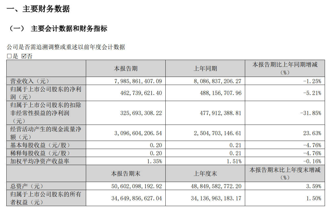实现营业收入79.86亿元,同比下降1.25%;归属于上市公司股东的净利润为4.63亿元,同比下降5.21%,环比下降65%。