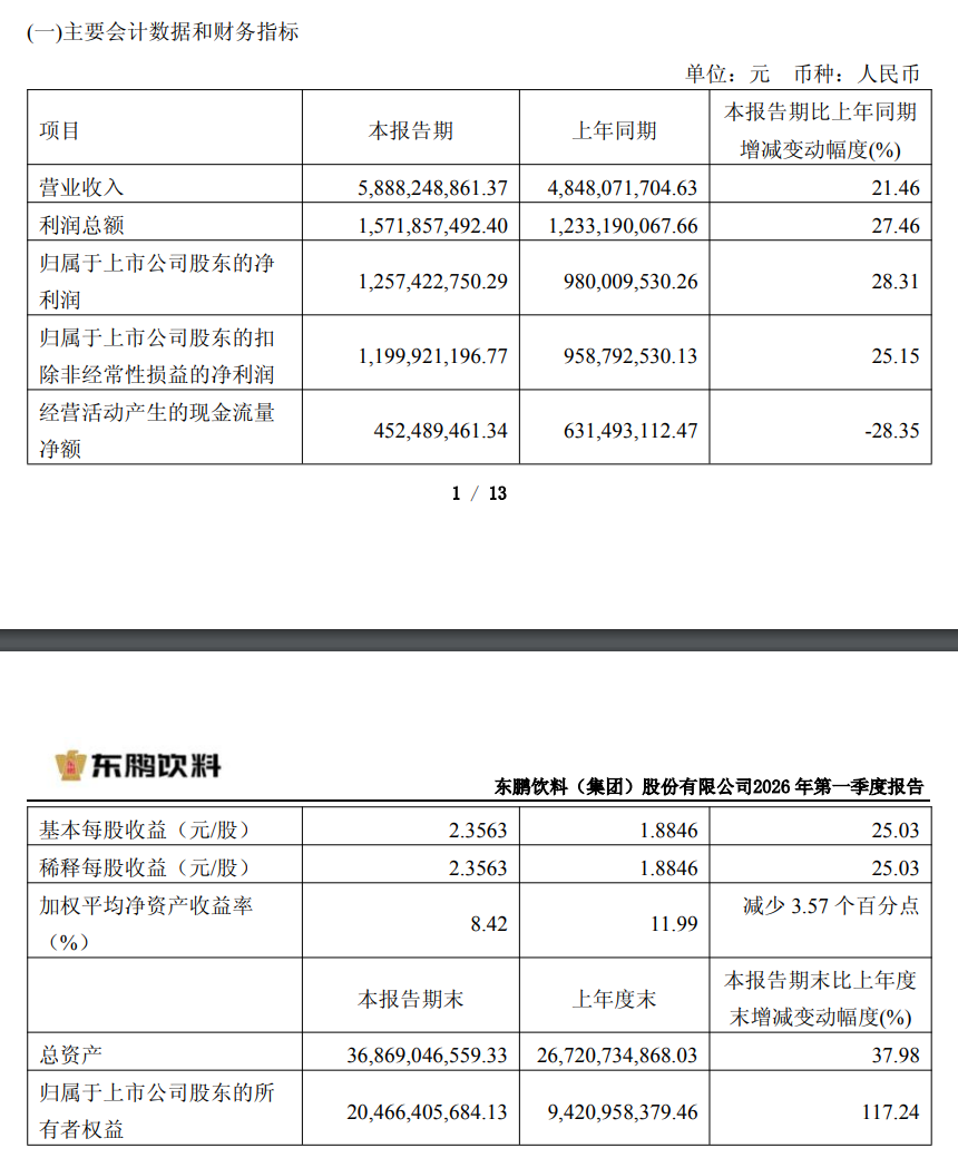 4月29日,东鹏饮料(605499.SH)公告称,2026年第一季度实现营业收入58.88亿元,同比增长21.46%;归属于上市公司股东的净利润为12.57亿元,同比增长28.31%。业绩变动主要系公司销售规模继续保持增长,营业收入较上年同期稳定增长。