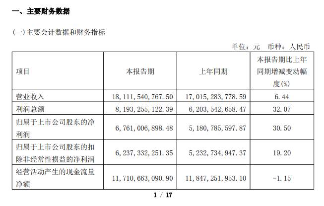 4月29日,长江电力(600900.SH)公告称,2026年第一季度实现营业收入181.12亿元,同比增长6.44%;归属于上市公司股东的净利润为67.61亿元,同比增长30.50%。业绩变动主要系公司售电收入增加及所持金融资产浮盈所致。