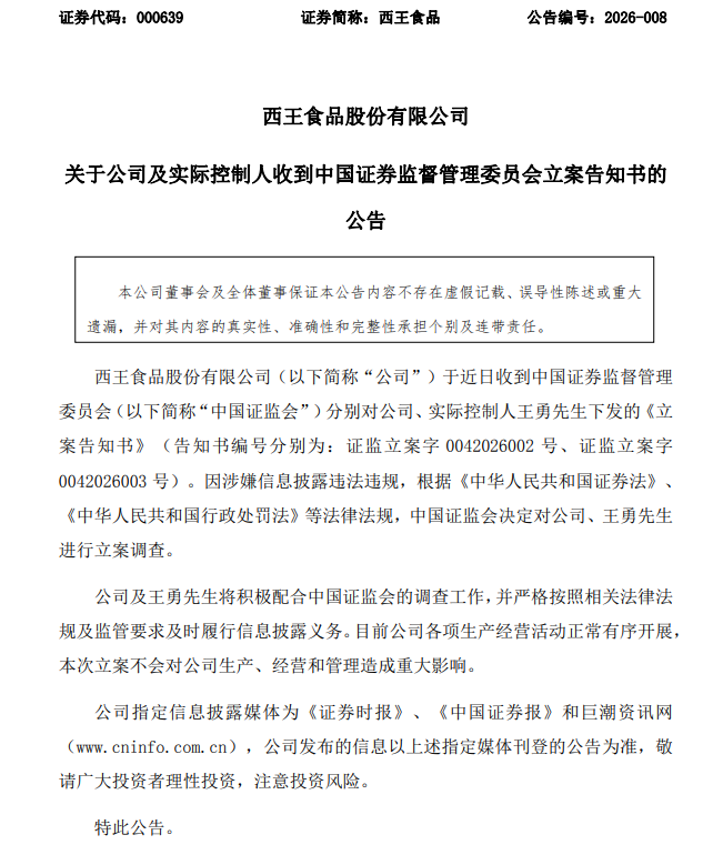 4月28日盘后,“玉米油第一股”的西王食品(000639.SZ)一口气披露了多份利空公告,不仅因“违规信披”被证监会立案调查,还因2025年财报内部控制被审计机构出具否定意见,股票交易即将戴帽ST。