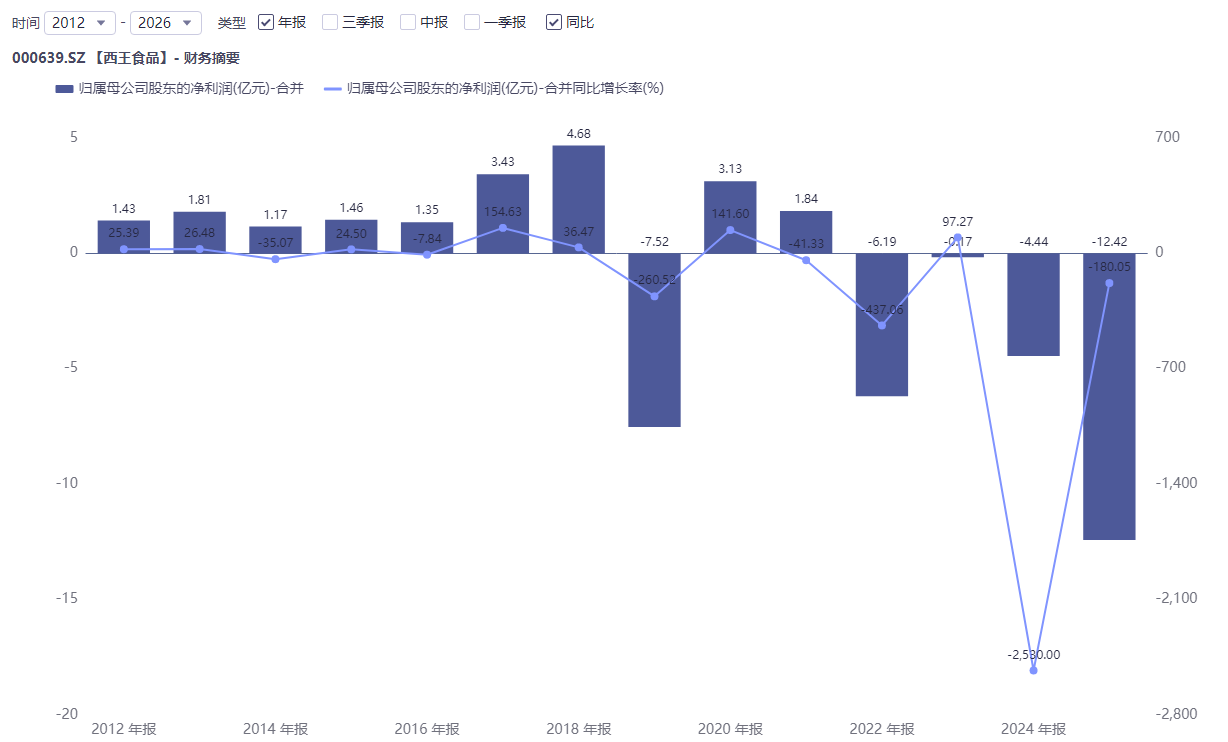 2025年,“西王食品”营收45.30亿元,同比下滑8.89%;净亏损12.42亿元,亏损幅度同比扩大180.05%。而在2026年一季度,又亏损了929.14万元,同比跌超223.62%。