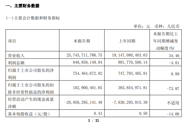 2026年第一季度营收为257.46亿元,同比增长34.46%;净利润为7.54亿元,同比增长0.89%。