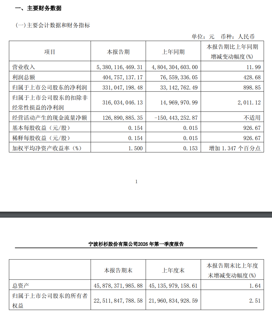4月29日,杉杉股份(600884.SH)发布2026年一季度财务报告。公司实现营业收入53.80亿元,同比增长11.99%;归属于上市公司股东的净利润为3.31亿元,同比增长898.85%。