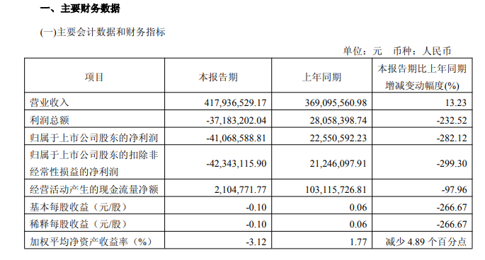 2026年第一季度实现营业收入4.18亿元,同比增长13.23%;归属于上市公司股东的净利润亏损4106.86万元,同比转亏。