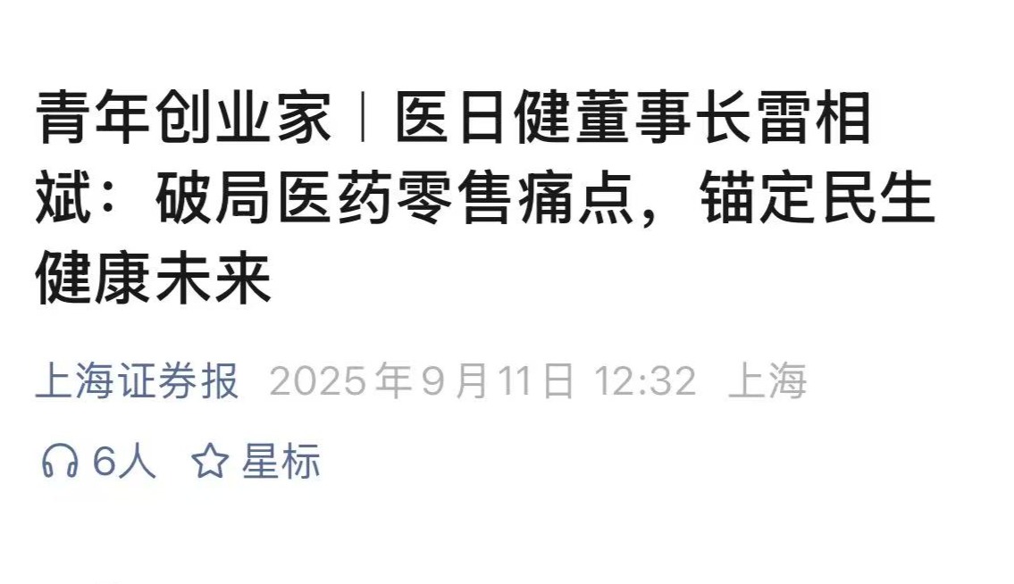 另外,《上海证券报》多平台2025年9月11日曾发布《青年创业家|医日健董事长雷相斌:破局医药零售痛点,锚定民生健康未来》,这篇报道中,上海证券报记者还对医日健董事长雷相斌进行了专访。