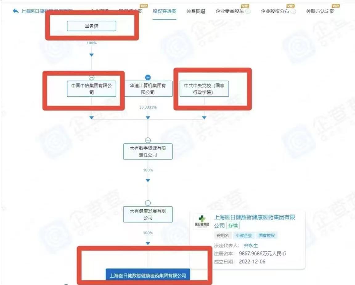 医日健最具迷惑性的是它的股权结构。企查查显示,截至4月29日,医日健最大股东为上海汗彦尔科技有限公司,经过层层穿透,背后的实控人竟然是国资委。但实际上,此长链条股权结构是假国企的代表形式。