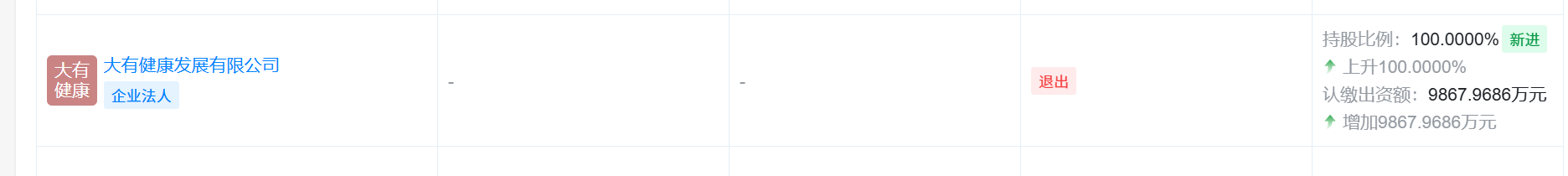 企查查信息显示,2024年1月,大有健康发展有限公司成为公司最大股东,而该公司为大有数字资源有限责任公司(下称“大有数字”)的全资子公司。但9个月后,2024年10月,大有健康发展有限公司变退出股东行列。