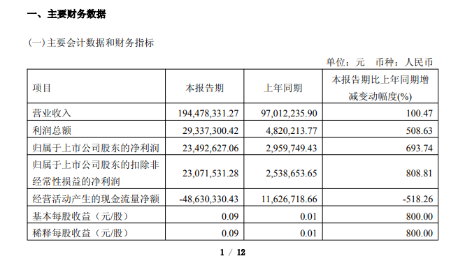 2026年第一季度实现营业收入1.94亿元,同比增长100.47%;归属于上市公司股东的净利润为2349.26万元,同比增长693.74%。