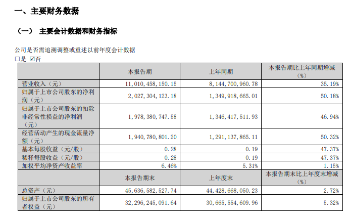 2026年第一季度实现营业收入110.10亿元,同比增长35.19%;归属于上市公司股东的净利润为20.27亿元,同比增长50.18%。