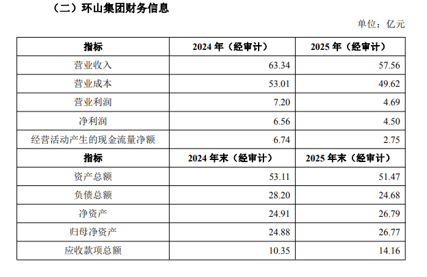 截至2025年年末,环山集团归母净资产26.77亿元,资产总额51.47亿元,负债24.68亿元,资产负债率不到48%。