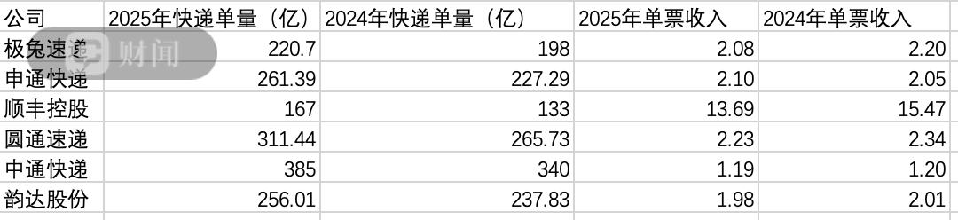 财闻梳理6家快递公司(京东物流暂无可比数据)的可比快递单量和单票价格发现,2025年各家快递的快递单量均保持上涨,但快递单票收入呈现稳定趋势。大多数快递公司的价格有略微下降,其中顺丰控股单票价格下调幅度接近2元。
