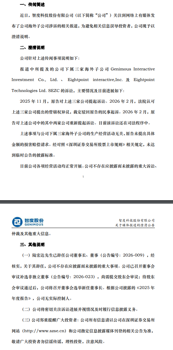 智度股份(000676.SZ)公告称,公司关注到网络媒体发布海外子公司涉诉报道,现澄清说明:下属三家海外子公司于2025年11月被起诉,2026年2月法院已认可管辖权异议并驳回原告起诉。