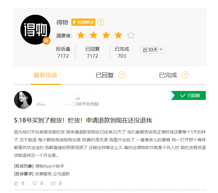 最新的一条投诉显示,该消费者在得物平台购买的唇膏存在质量问题,在申请退款后,22天仍然没有收到款项,后续表示没有任何平台的人联系她,客服也一直是敷衍态度。