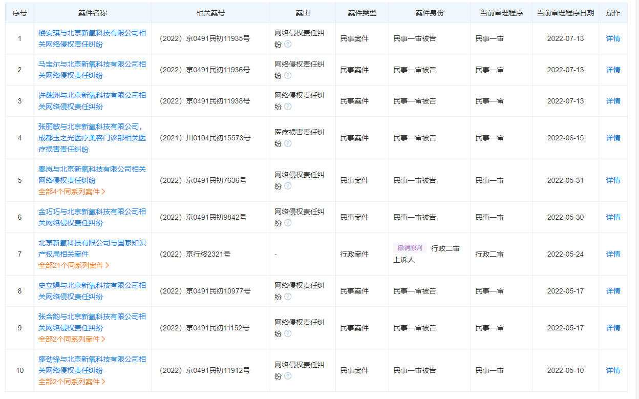 据天眼查,北京新氧科技有限公司(以下简称“新氧”)新增多条网络侵权责任纠纷案件,原告方包括:秦岚、许魏洲、蒋勤勤、张含韵、金巧巧等明星。据不完全统计,自2016年10月以来,共有90余位明星因“网络侵权责任纠纷、肖像权纠纷”起诉新氧医美,除上述明星外,还有鹿晗、华晨宇、鞠婧祎等明星。