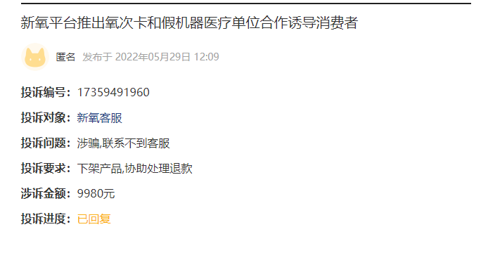 不过银柿财经记者注意到,在消费者服务平台黑猫投诉上,仍有不少消费者质疑新氧虚假宣传。有用户表示,在新氧平台上的一家机构做了一次超皮秒,一次M22(光子嫩肤),次次过敏,同时发现机构的仪器没有官方授权,平台客服也联系不上,因此要求下架相关产品,并协助退款。