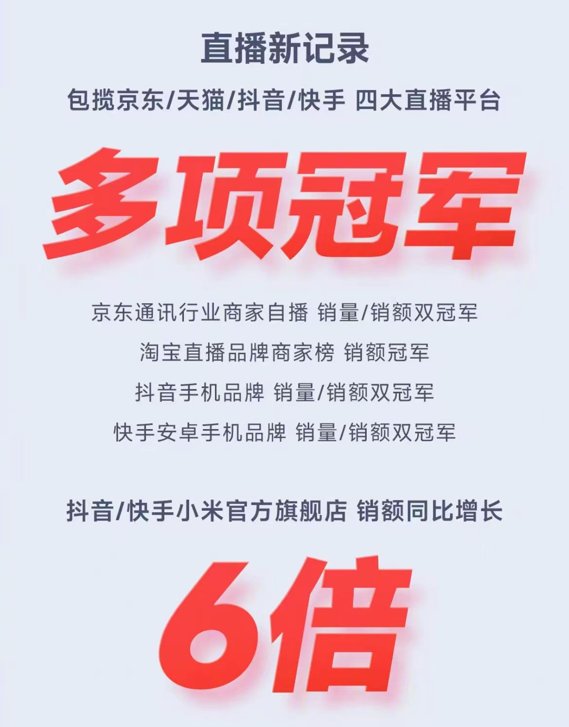荣耀在战报中公布其抖音官方旗舰店“6·18”全程销售额同比增长185%,快手官方直播间“6·18”全程自播销售额超去年全年。小米则表示,其包揽京东/天猫/抖音/快手四大直播平台多项冠军,抖音、快手小米官方旗舰店的销额同比增长6倍。