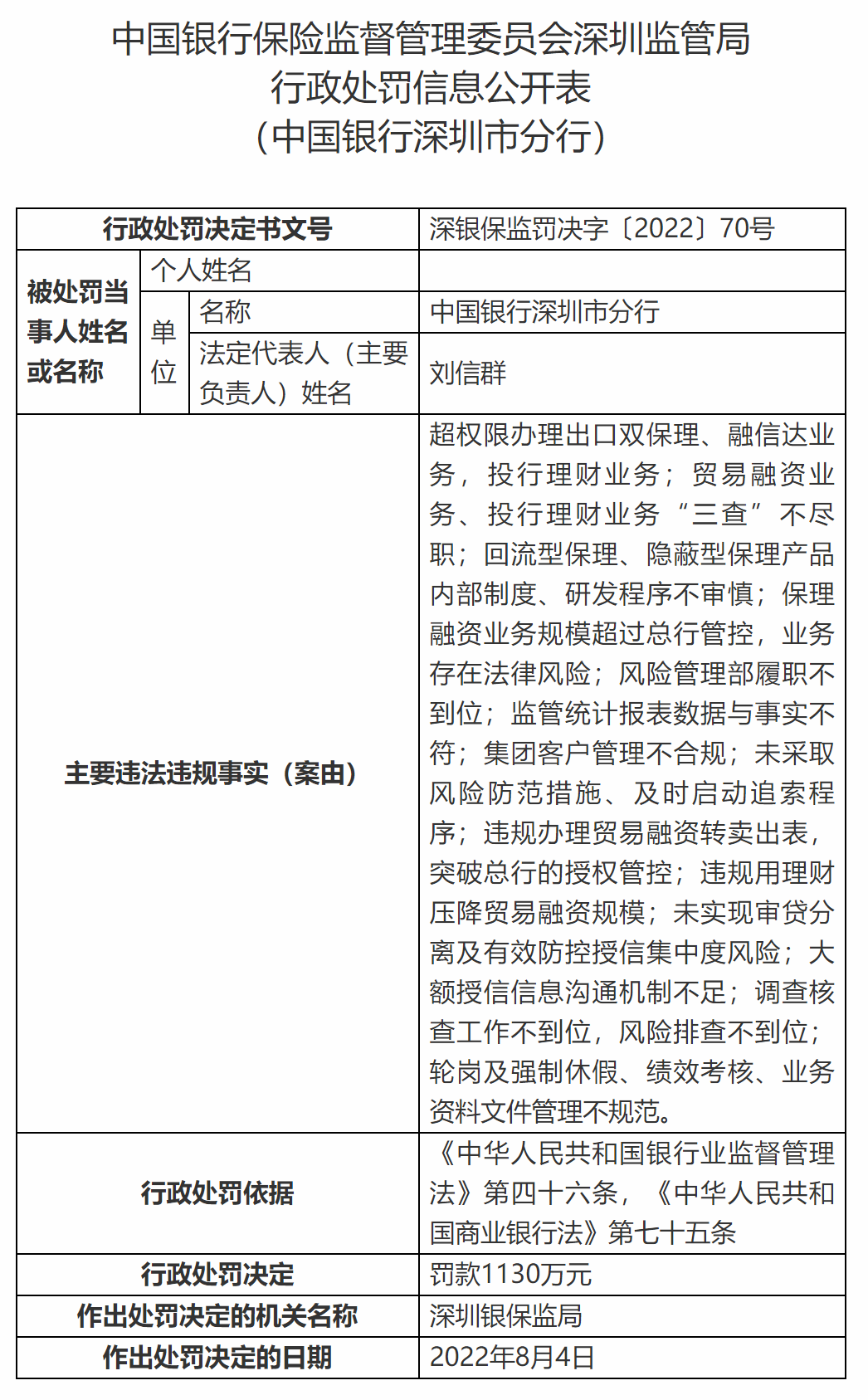 中国银行深圳市分行由于14项违规被深圳银保监局罚款1130万元,这也是中行今年内收到的最大罚单。
