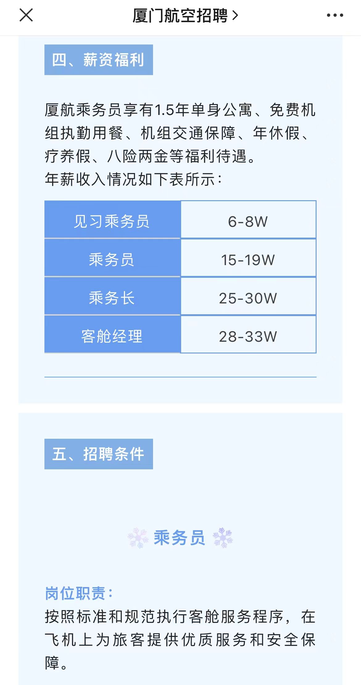 还有航空公司开出高薪“招兵买马”。比如,厦门航空就在招聘信息里提到了乘务员的薪资福利,不仅享有1.5年单身公寓、机组交通保障、年休假等待遇,还明确列出收入情况,其中客舱经理年薪最高可达33万元。