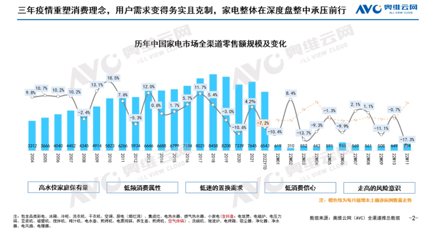 这一预期来之不易。奥维云网数据显示,过去数年,家电行业进入调整期,中国家电市场全渠道零售额从2018年的8458亿元,下降至2020年和2021年的7339亿元、7645亿元。