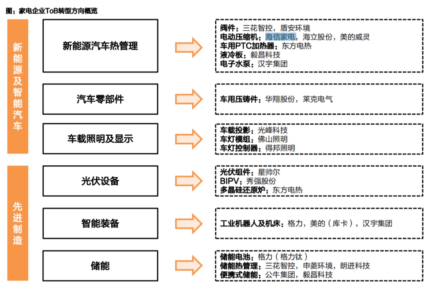 据天风证券研报,先进制造、新能源及智能汽车成为家电企业跨界的两大方向。其中,格力电器(000651.SZ)、美的均进入智能装备领域,海信家电(000921.SZ)、三花智控(002050.SZ)、盾安环境(002011.SZ)等公司则切入新能源汽车热管理领域。