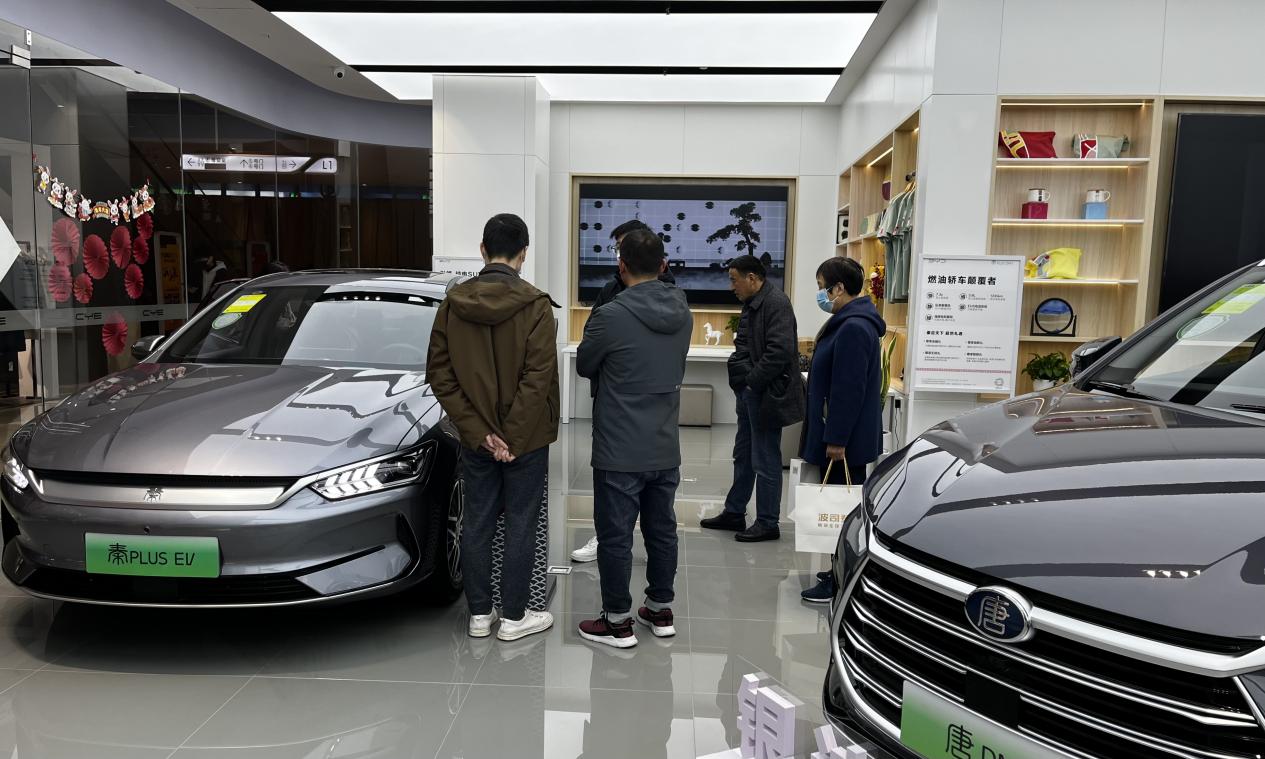 不算宽敞的比亚迪王朝门店店内挤满秦、唐、汉、元四款车型,即使元旦刚涨过价,也丝毫不影响进店客流。笔者在商场停留的两小时内,约四五批消费者接连进店看车,多为一家老幼或中年人。