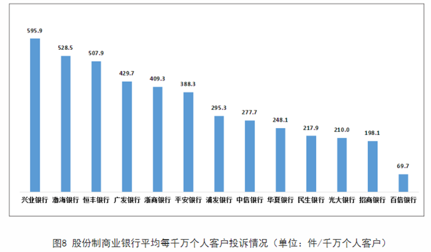 与业务量对比来看,平安银行平均每千营业网点投诉量为3899.7件,在股份行中最多。兴业银行、渤海银行、恒丰银行平均每千万个人客户投诉量位列股份行前三,分别为595.9件、528.5件和507.9件。