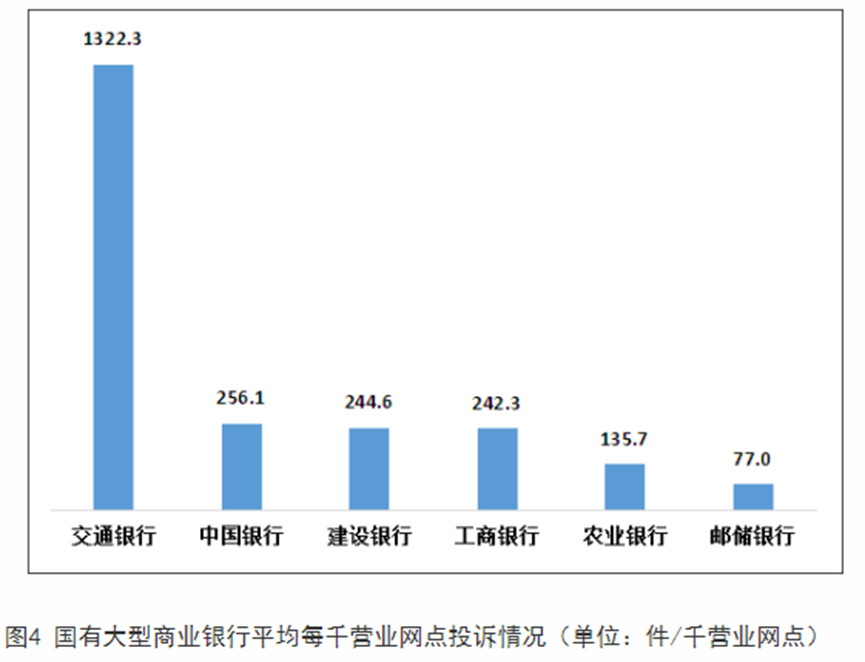 值得一提的是,除去年第三季度外,交通银行在去年前两个季度中的平均每千营业网点投诉量和平均每千万个人客户投诉量也均位于国有大行首位。