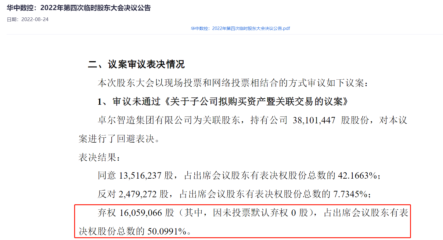 翻看公告后笔者发现,该项议案的弃权票占出席会议股东有表决权总数的比例居然高达50.0991%(弃权1605.91万股)。而根据华中数控2022年三季报,该部分股份与第二大股东武汉华中科大资产管理有限公司(以下称“华科资产”)所持有股份数重合。
